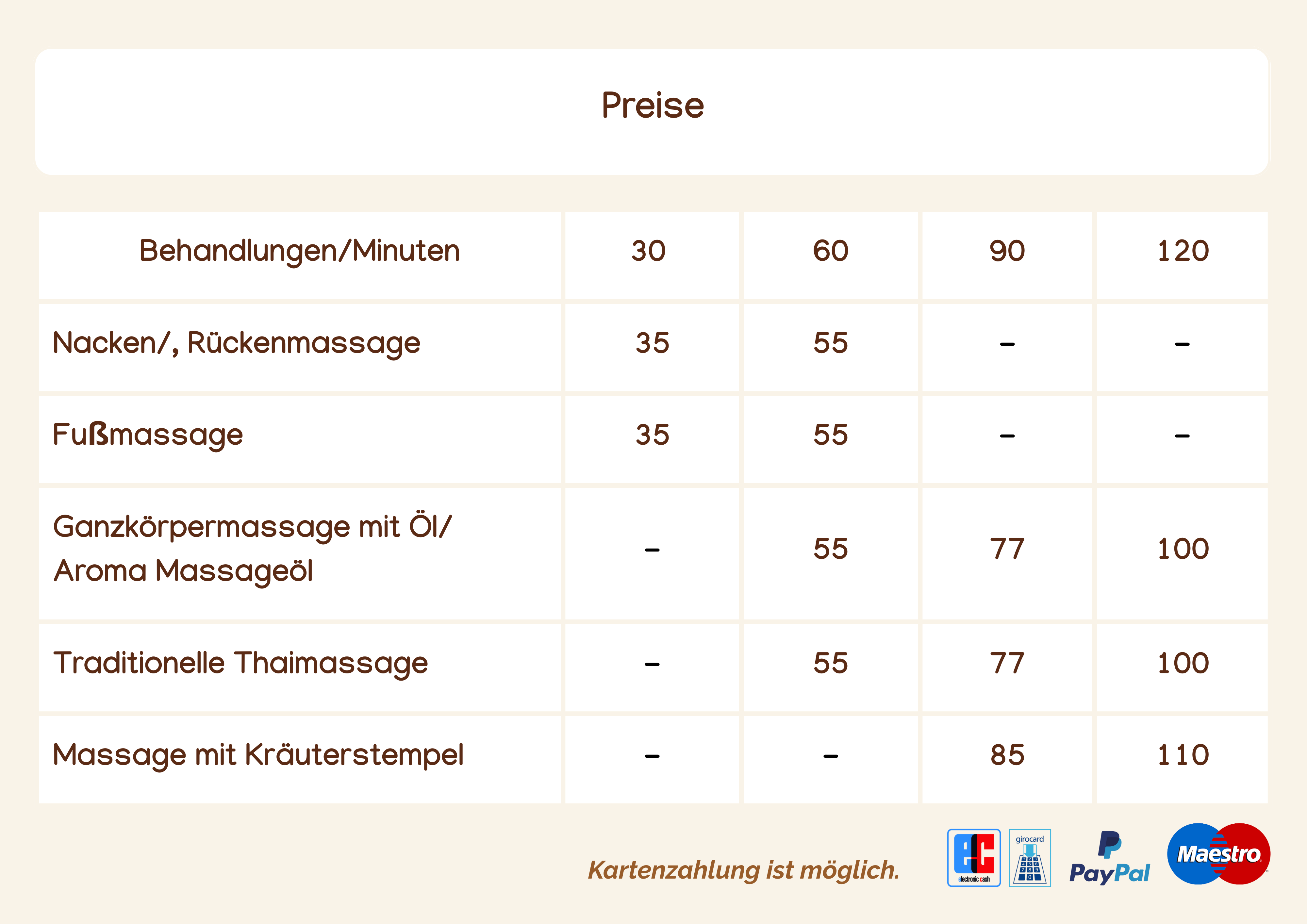 Ich biete Ihnen Massagen zum Entspannen von Körper und Geist für ein besseres Wohlbefinden. Wenn Sie vorbeikommen, fühlen Sie Stressabbau und den Fluss der Energie.